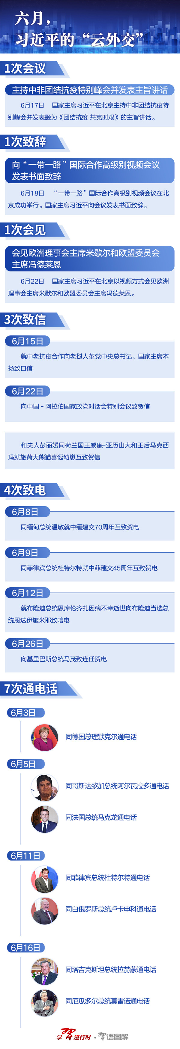 6月,習(xí)近平同德國(guó)總理默克爾、法國(guó)總統(tǒng)馬克龍、哥斯達(dá)黎加總統(tǒng)阿爾瓦拉多等外國(guó)領(lǐng)導(dǎo)人通電話;向中國(guó)-阿拉伯國(guó)家政黨對(duì)話會(huì)特別會(huì)議致賀信;以視頻方式主持中非團(tuán)結(jié)抗疫特別峰會(huì)、會(huì)見歐洲理事會(huì)主席米歇爾和歐盟委員會(huì)主席馮德萊恩……
