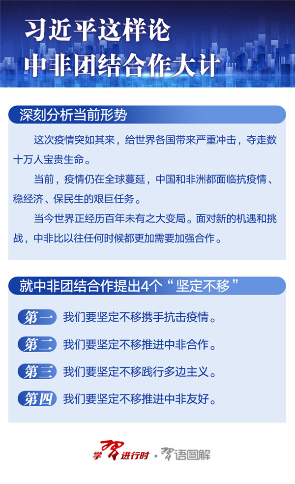 17日,習(xí)近平在中非團(tuán)結(jié)抗疫特別峰會(huì)上提出四個(gè)“堅(jiān)定不移”,指明了疫情形勢(shì)下中非抗疫及務(wù)實(shí)合作的前行路徑,指明了中非關(guān)系發(fā)展的未來(lái)方向。