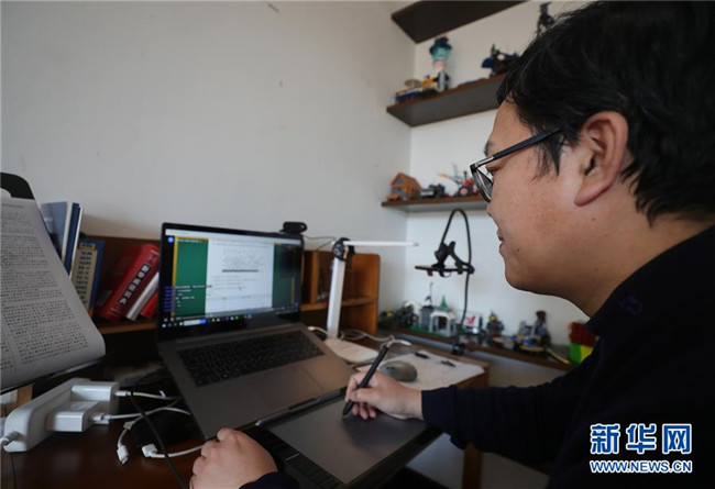 遼寧省沈陽市蘇家屯區(qū)青松中學(xué)杜波老師在家中通過網(wǎng)絡(luò)平臺(tái)給同學(xué)們上化學(xué)課(3月11日攝)。新華社記者 楊青 攝
