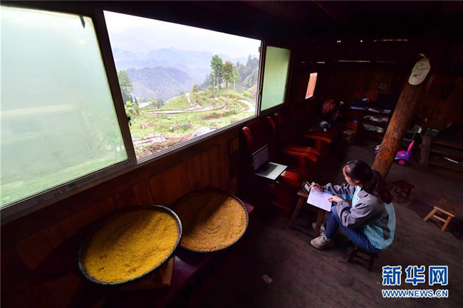 在廣西融水苗族自治縣桿洞鄉(xiāng)黨鳩村,就讀于廣西科技師范學(xué)院的梁孟香在家里上網(wǎng)課(4月9日攝)。新華社記者 黃孝邦 攝