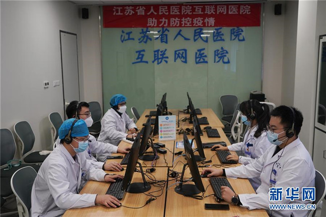 在江蘇省人民醫(yī)院互聯(lián)網(wǎng)醫(yī)院辦公室,醫(yī)生和信息處的工作人員在工作(2月7日攝)。新華社記者 季春鵬 攝