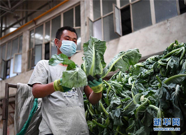 7月18日,在烏魯木齊市沙依巴克區(qū)新疆九鼎農產品批發(fā)市場,一商戶整理蔬菜。 新華社記者 宋彥樺 攝