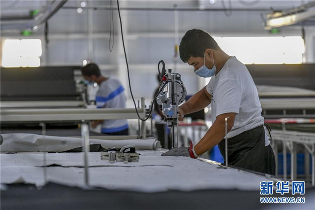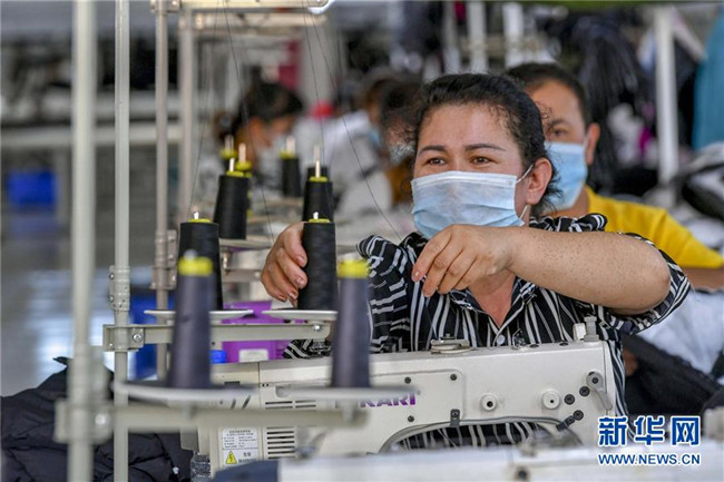 7月19日,在新疆喀什地區(qū)巴楚縣紡織服裝產業(yè)園一服裝企業(yè)車間,員工正在忙碌。 新華社記者 馬鍇 攝