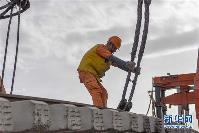 中鐵一局施工人員在格庫鐵路(青海格爾木至新疆庫爾勒)新疆段建設現(xiàn)場作業(yè)(7月18日攝)。 新華社記者 丁磊 攝