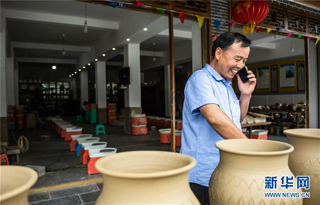 遵義市播州區(qū)花茂村村民母先才接到外地客商下訂單的電話(6月16日攝)。新華社記者 陶亮 攝