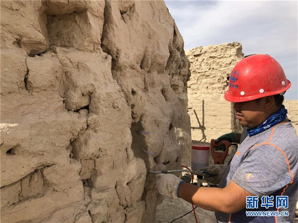 工作人員采用原土泥漿對三間房遺址的裂隙進行灌注封堵處理(7月26日攝,手機照片)。新華社發(fā)(中鐵西北科學(xué)研究院有限公司提供)