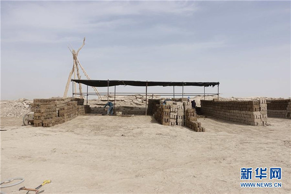 工作人員選取樓蘭古城外圍的土料制備土坯(7月1日攝)。新華社發(fā)(中鐵西北科學(xué)研究院有限公司提供)