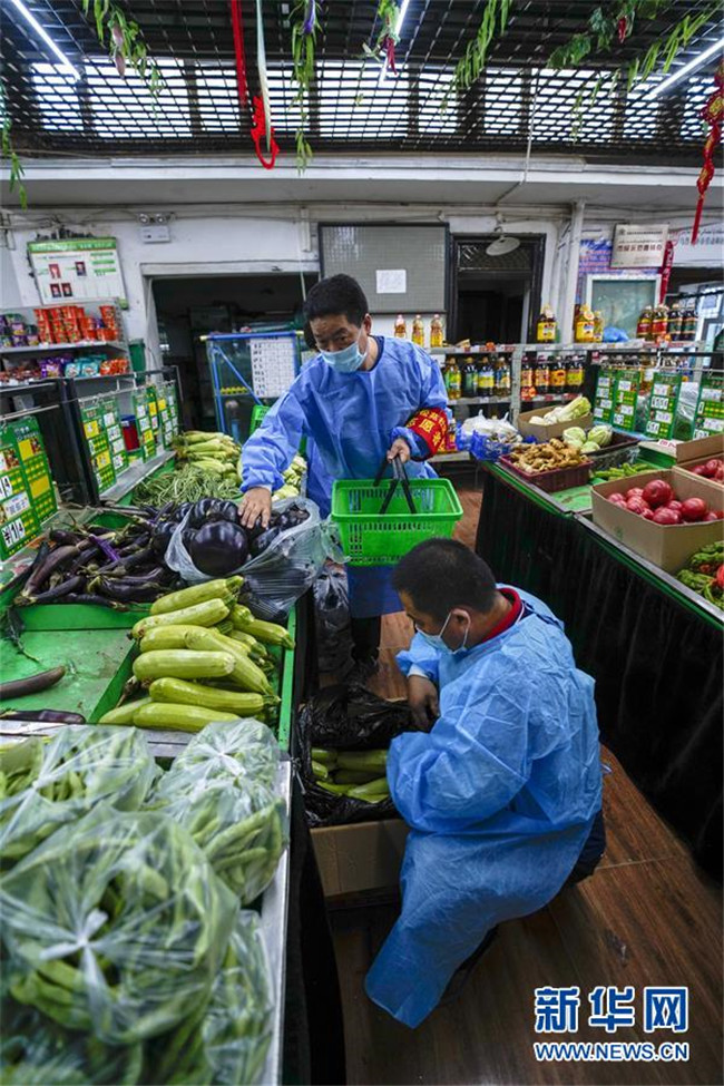在烏魯木齊市沙依巴克區(qū)揚子江街道青松苑社區(qū)蔬菜直銷點,陳金奇(前)幫助為小區(qū)居民采買的志愿者按照網絡訂單挑選蔬菜(8月8日攝)。新華社記者 趙戈 攝