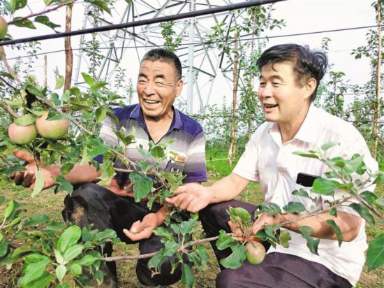 看著自家地里的蘋果長勢旺盛,楊天軍(左一)按捺不住心中的喜悅。本報(bào)記者 高山攝