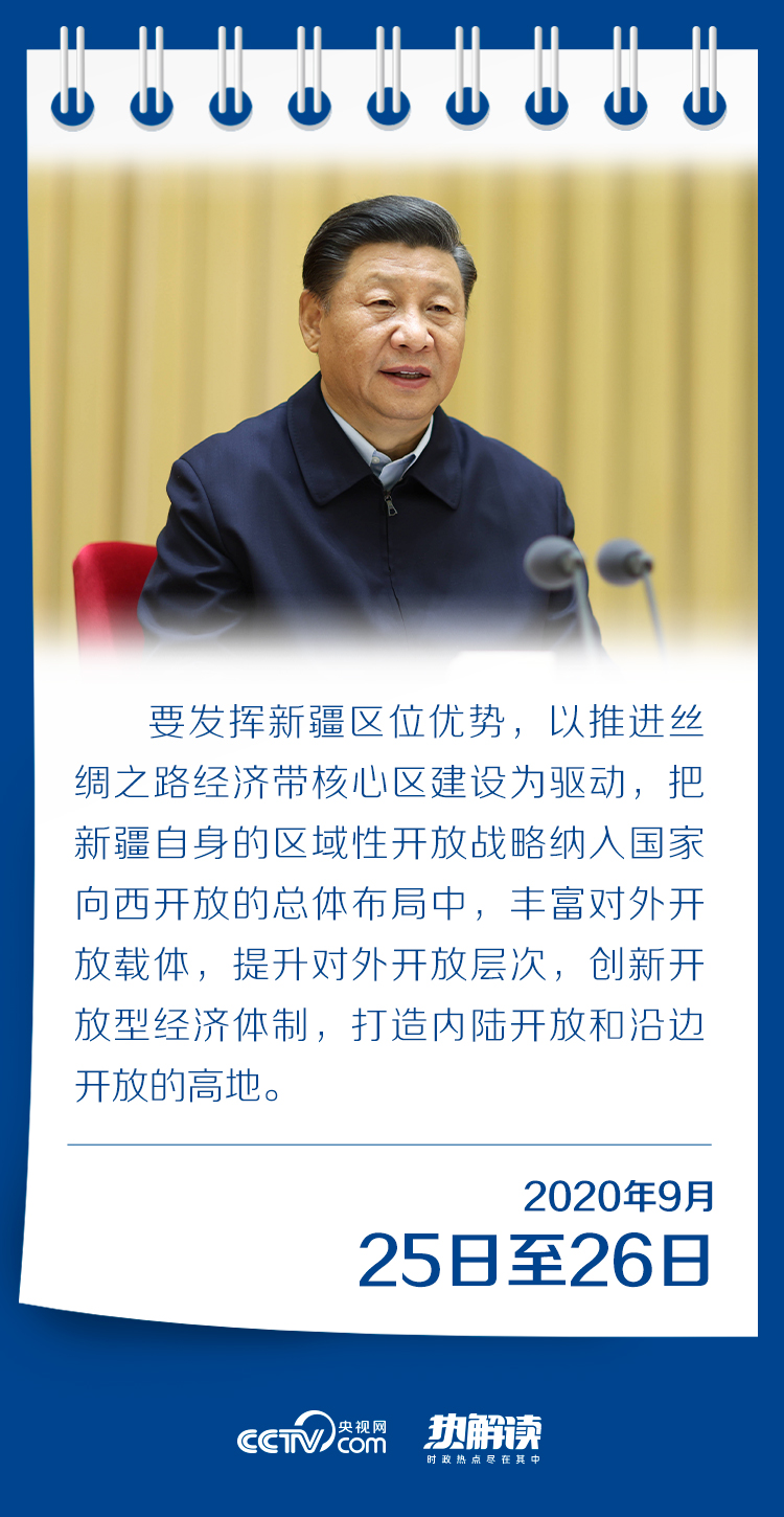 總書記說,要發(fā)揮新疆區(qū)位優(yōu)勢,以推進(jìn)絲綢之路經(jīng)濟(jì)帶核心區(qū)建設(shè)為驅(qū)動,把新疆自身的區(qū)域性開放戰(zhàn)略納入國家向西開放的總體布局中,豐富對外開放載體,提升對外開放層次,創(chuàng)新開放型經(jīng)濟(jì)體制,打造內(nèi)陸開放和沿邊開放的高地。
