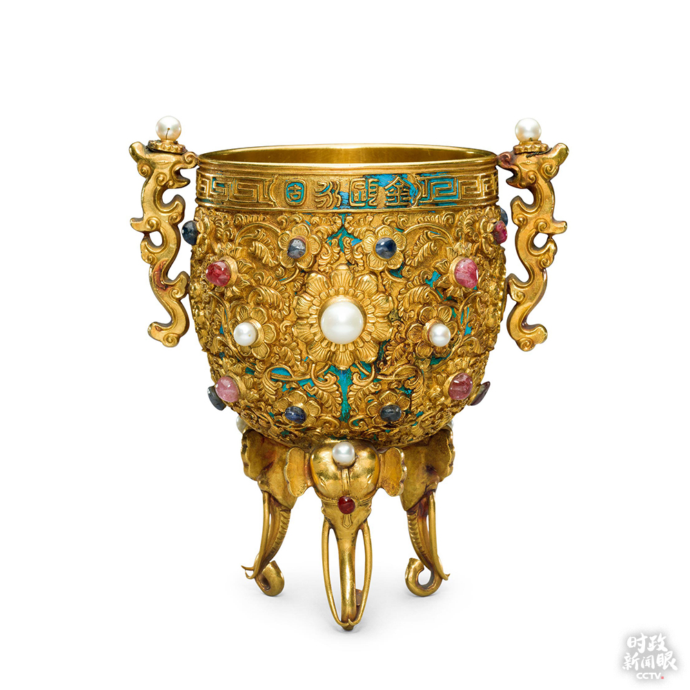 △正在故宮博物館展出的金嵌珠寶金甌永固杯,通體以點(diǎn)翠為地,造型優(yōu)美。(來(lái)源于故宮博物院官網(wǎng))