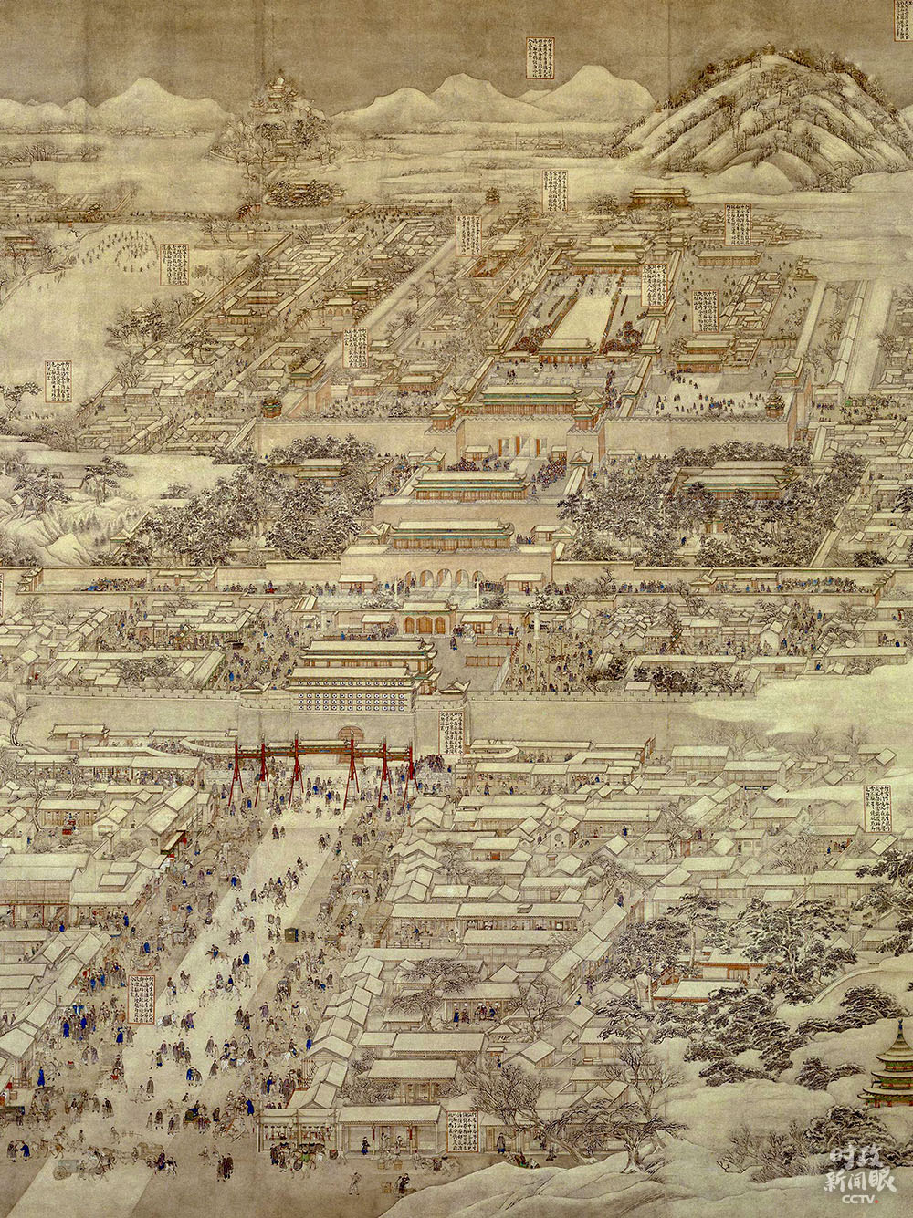 △這是《京師生春詩(shī)意圖》軸,由清代宮廷畫(huà)家徐揚(yáng)繪制。從上至下的鳥(niǎo)瞰式構(gòu)圖,為后人研究北京城城建布局提供了寶貴參考。(來(lái)源于故宮博物院官網(wǎng))