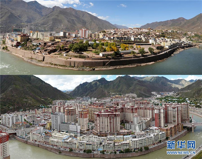 這張拼版照片顯示的是:上世紀(jì)50年代的昌都(上)和上世紀(jì)80年代的昌都景色(資料照片)。新華社發(fā)