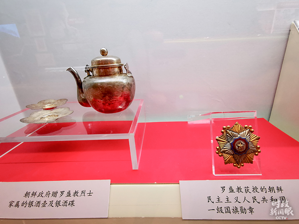 △左為朝鮮政府贈給羅盛教烈士家屬的銀酒壺、銀酒碟,右為羅盛教獲授的朝鮮民主主義人民共和國一級國旗勛章。