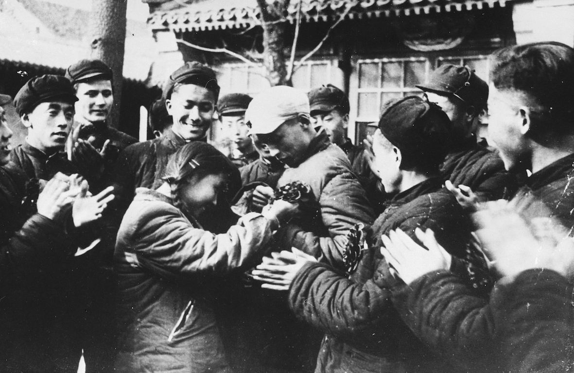 △1950年12月,北京,報(bào)名參加抗美援朝的學(xué)子被同學(xué)們戴上光榮花。
