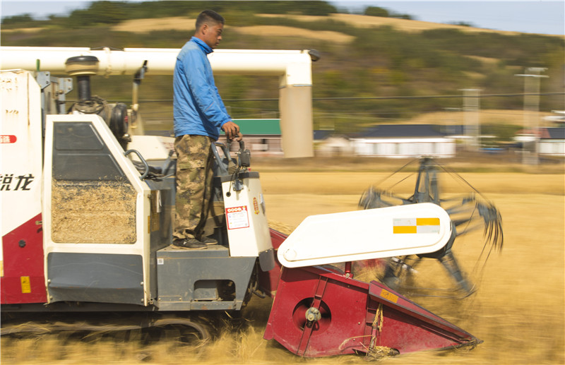 在吉林省延邊州和龍市光東村稻田里,農(nóng)民駕駛收割機(jī)收獲成熟的水稻(2019年10月10日攝)。新華社記者 許暢 攝