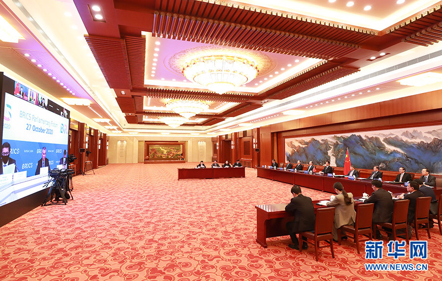 10月27日,全國(guó)人大常委會(huì)委員長(zhǎng)栗戰(zhàn)書(shū)在北京人民大會(huì)堂出席第六屆金磚國(guó)家議會(huì)論壇視頻會(huì)議并發(fā)表講話。 新華社記者 龐興雷 攝
