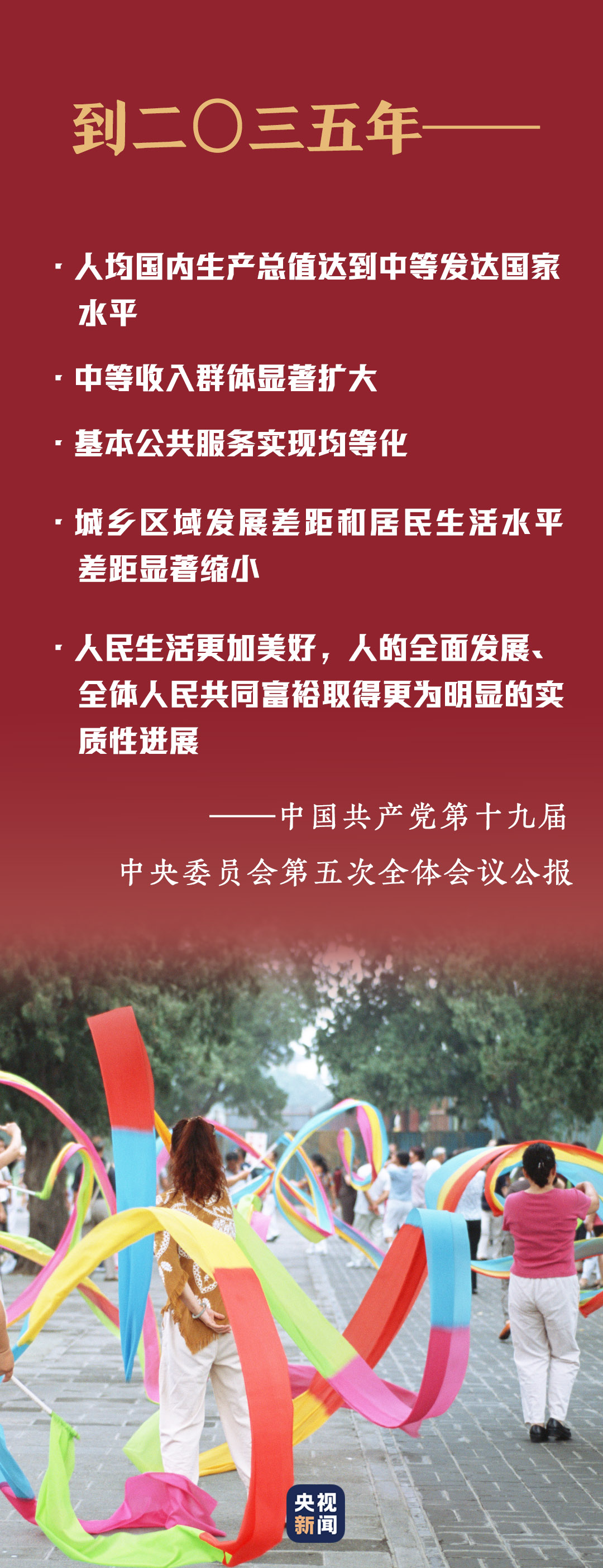 十九屆五中全會提出到二〇三五年基本實現(xiàn)社會主義現(xiàn)代化遠景目標。到那時,人民生活更加美好,人的全面發(fā)展、全體人民共同富裕取得更為明顯的實質性進展。