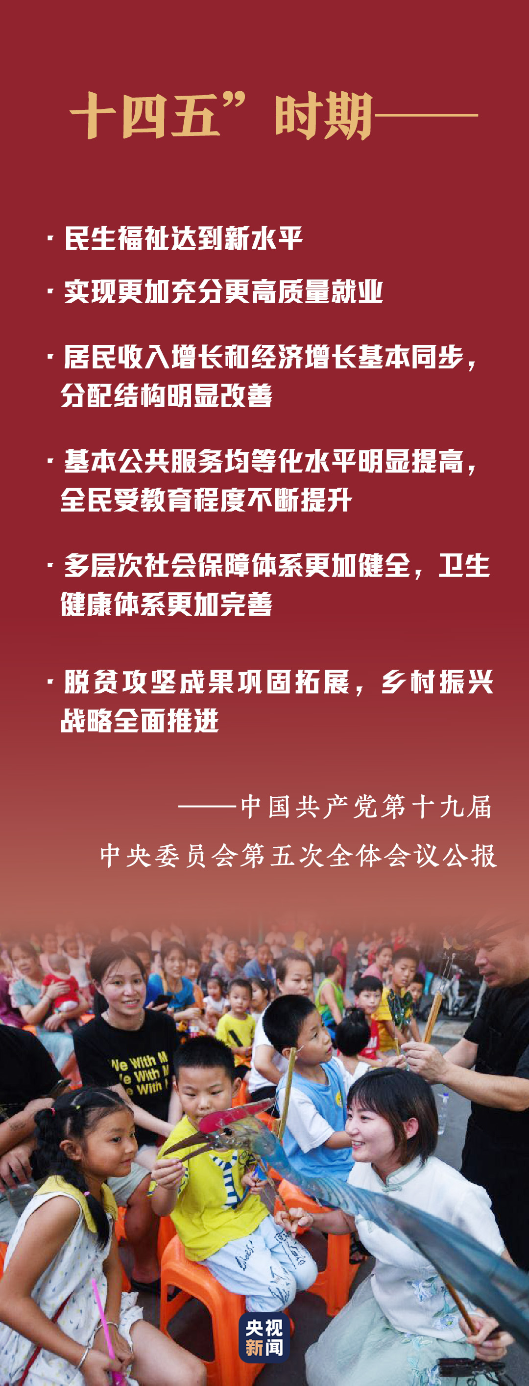 十九屆五中全會提出,不斷增強人民群眾獲得感、幸福感、安全感,促進人的全面發(fā)展和社會全面進步。“以滿足人民日益增長的美好生活需要為根本目的”“堅持以人民為中心,堅持新發(fā)展理念,堅持深化改革開放,堅持系統(tǒng)觀念”“改善人民生活品質,提高社會建設水平”......