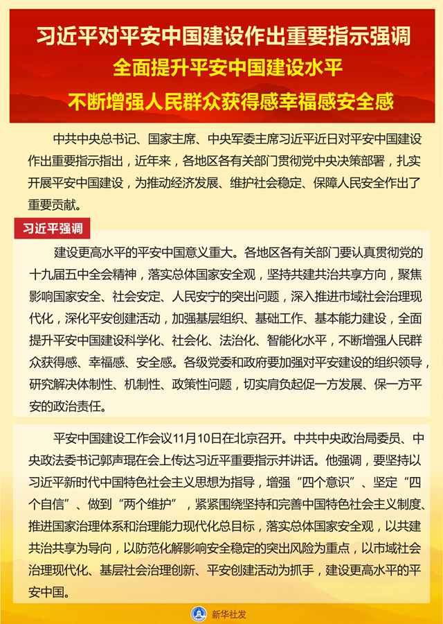 新華社北京11月11日電 中共中央總書記、國(guó)家主席、中央軍委主席習(xí)近平近日對(duì)平安中國(guó)建設(shè)作出重要指示指出,近年來(lái),各地區(qū)各有關(guān)部門貫徹黨中央決策部署,扎實(shí)開(kāi)展平安中國(guó)建設(shè),為推動(dòng)經(jīng)濟(jì)發(fā)展、維護(hù)社會(huì)穩(wěn)定、保障人民安全作出了重要貢獻(xiàn)。