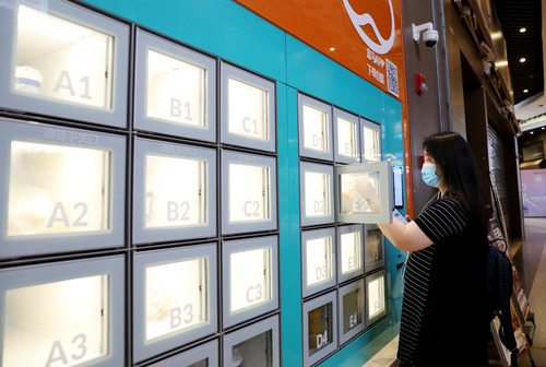一位顧客通過APP掃碼,在上海地鐵13號線世博會博物館地鐵站附近的一家盒小馬服務(wù)點取餐柜中拿取預(yù)定的早餐(7月17日攝)。新華社記者 方喆 攝
