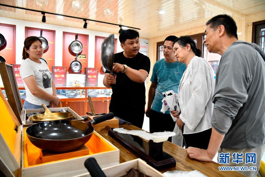 在濟南市章丘區(qū)三澗溪村美食街,游客在購買章丘鐵鍋(6月23日攝)。新華社記者 郭緒雷 攝