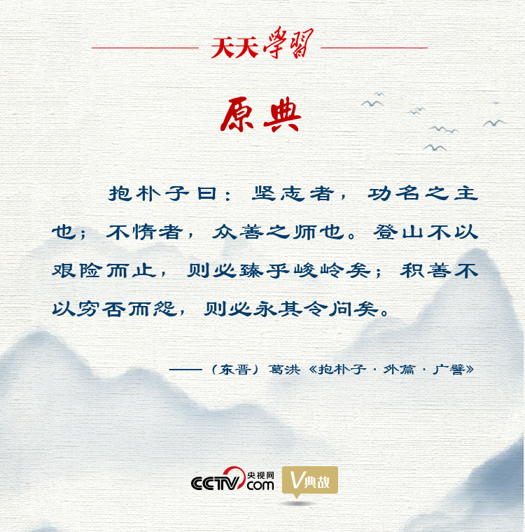 在《外篇·廣譬》中,葛洪提出:“堅(jiān)志者,功名之主也;不惰者,眾善之師也。登山不以艱險(xiǎn)而止,則必臻乎峻嶺矣;積善不以窮否而怨,則必永其令問矣。”意思是意志堅(jiān)定,是建功立業(yè)的主導(dǎo);勤奮不怠,是一切善行的老師。登山不因?yàn)槠D難險(xiǎn)阻而停止,就一定會到達(dá)頂峰;行善不因?yàn)樽陨砀F困與否而埋怨,就一定會使自己的美譽(yù)長久。用登山作譬,指出意志堅(jiān)定和勤奮不怠是事業(yè)成功的重要保證。