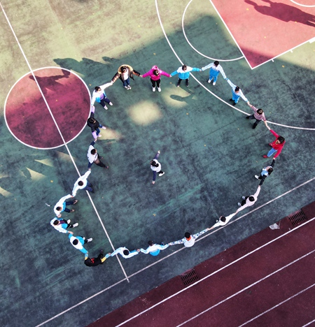 11月9日,在貴州省遵義市鳳岡縣特殊教育學校,老師帶領(lǐng)學生們在操場做游戲。視覺中國供圖