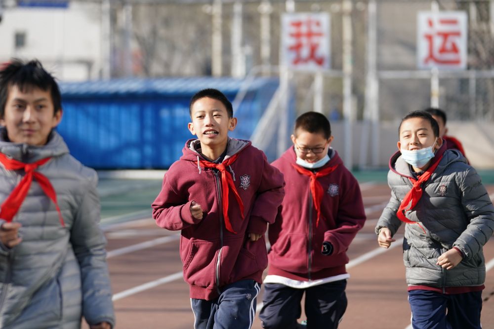 12月21日,在北京四中廣外校區(qū),蔡昊霖(左二)和同學一起上體育課。