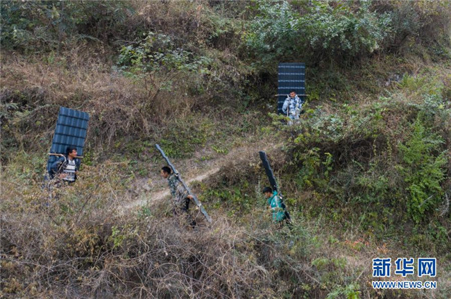 某色蘇不惹(右二)和同伴背著“雙十一”采購的貨物回村(2019年11月16日攝,無人機(jī)照片)。新華社記者 江宏景 攝