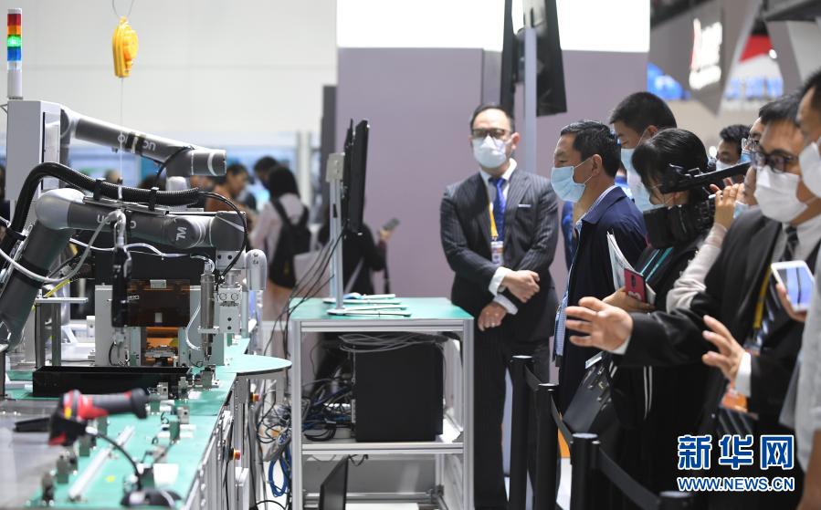 2020年11月6日,在進(jìn)博會技術(shù)裝備展區(qū),人們在西門子展臺觀看人機協(xié)作的智能化單元生產(chǎn)線。新華社記者 李任滋 攝