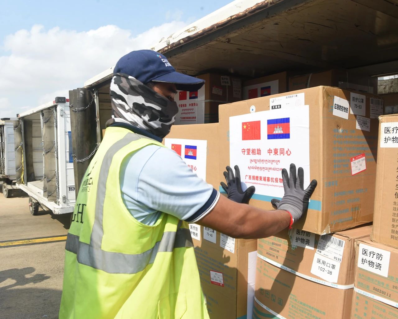 △2020年3月23日,一架搭載7名來自廣西壯族自治區(qū)醫(yī)療專家和一批防疫醫(yī)療物資的中國(guó)南航包機(jī)降落在柬埔寨首都金邊國(guó)際機(jī)場(chǎng)。