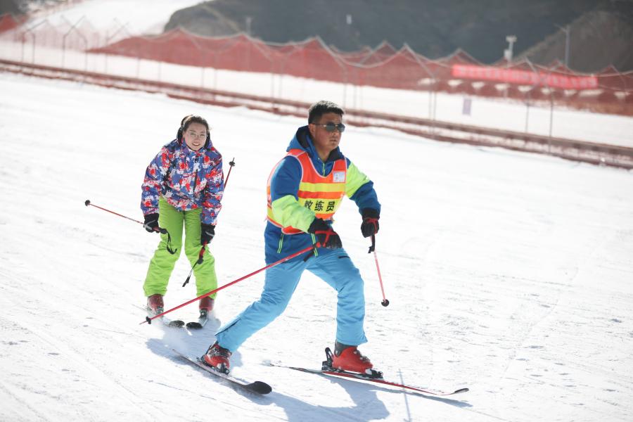▲ 1月8日,在甘肅白銀國(guó)家雪上項(xiàng)目訓(xùn)練基地,一名教練指導(dǎo)滑雪愛(ài)好者滑雪。新華社記者 馬希平 攝