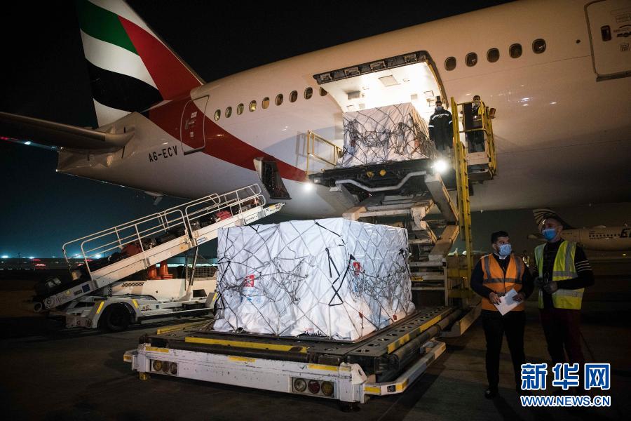 2020年12月10日,在埃及開羅國際機(jī)場,工作人員運輸中國研制生產(chǎn)的新冠疫苗。新華社記者鄔惠我攝