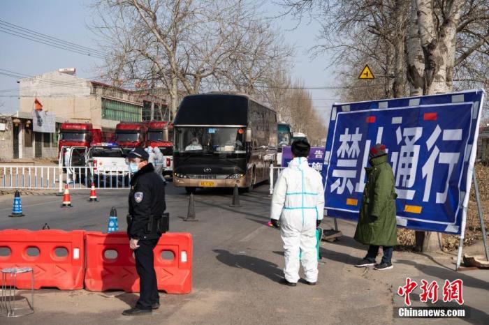 圖為距離增村鎮(zhèn)約4公里、距離小果莊村約8公里的一處疫情防控檢查點(diǎn),運(yùn)送異地集中隔離觀察人員的車(chē)輛通過(guò)此地。 中新社記者 侯宇 攝