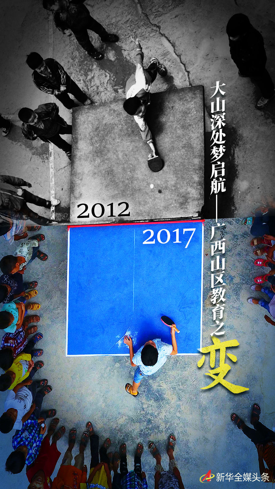 拼版照片:上圖為在廣西大化瑤族自治縣板升鄉(xiāng)弄勇小學(xué),孩子們?cè)诖蚱古仪颍?017年9月4日攝,無人機(jī)照片);下圖為在弄勇小學(xué),孩子們?cè)诖蚱古仪颍?012年12月26日攝)。新華社記者 黃孝邦 攝