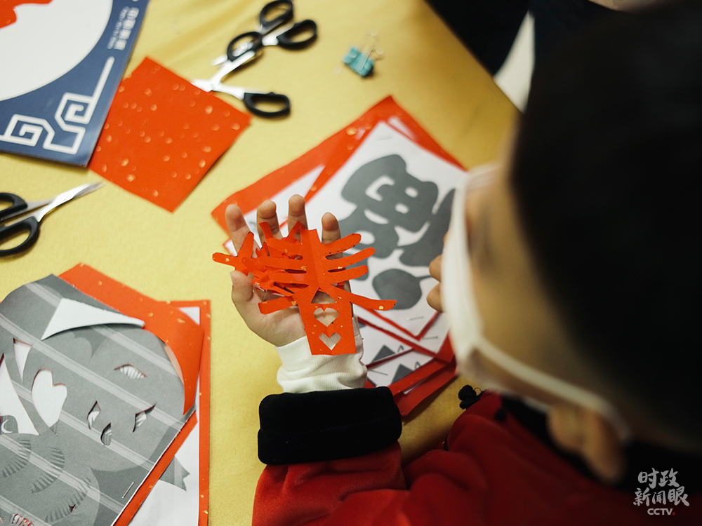 △孩子們在社區(qū)活動(dòng)室練習(xí)剪紙。(總臺央視記者王哈男拍攝)