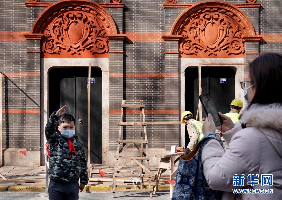 2月4日,上海市民林女士在修繕中的中共一大會址前為小學(xué)三年級的兒子拍照。新華社記者 劉穎 攝