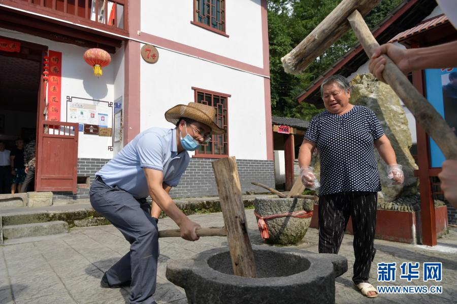 游客在江西省井岡山市神山村村民左秀發(fā)家體驗手打糍粑(2020年7月15日攝)。新華社記者 彭昭之 攝