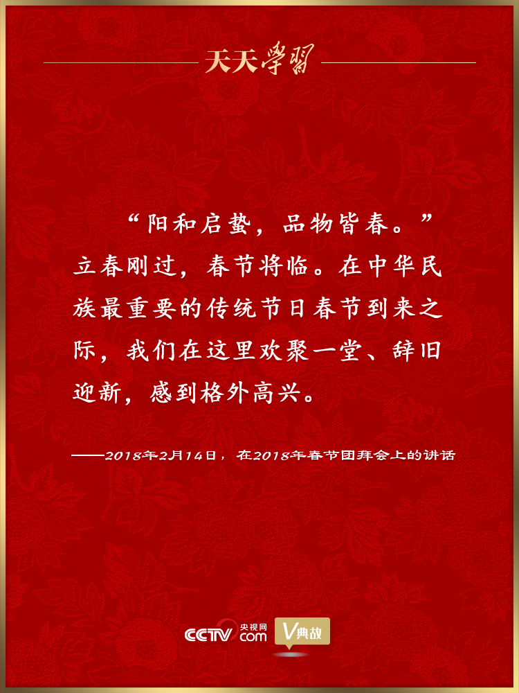 2018年,祖國大地春來早,立春剛過,春節(jié)將臨。在春節(jié)團拜會上,習近平總書記在講話開場即引用“陽和啟蟄,品物皆春”這一名句,描繪了祖國大地春風拂面、萬象更新的景象。