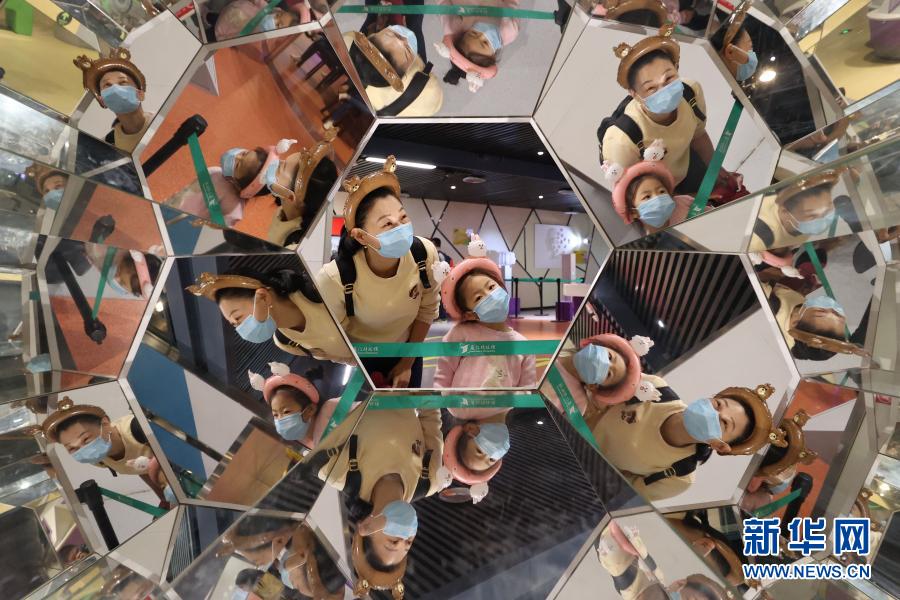 2月16日,小朋友和家長在廈門科技館體驗鈍角六面體鏡。新華社發(fā)(曾德猛 攝)
