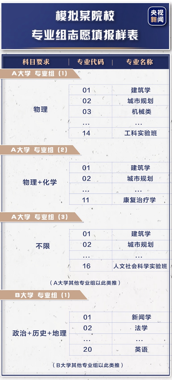 學(xué)生在填報(bào)志愿表時(shí),按照“院校專業(yè)組+專業(yè)”的方式填寫,只要選考科目符合要求,學(xué)生就可以在志愿表第1行填寫A大學(xué)專業(yè)組(1)+該專業(yè)組后面的幾個(gè)專業(yè),第2行填寫A大學(xué)專業(yè)組(2)+該專業(yè)組后面的幾個(gè)專業(yè),以此類推。