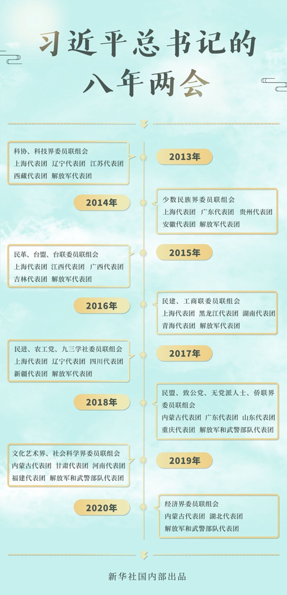 2013-2020,八年的全國兩會(huì)上,總書記46次到團(tuán)組參加審議討論。交流之中,語重心長;言談之間,發(fā)人深思。