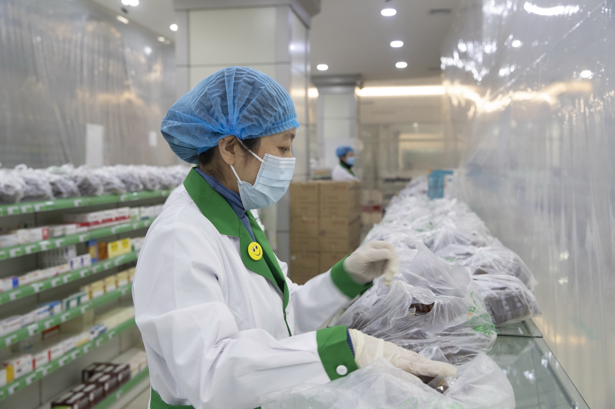 ↑2021年1月25日,在黑龍江綏化市泰華大藥房內(nèi),工作人員打包中藥湯劑。為應對新冠肺炎疫情,綏化市指定醫(yī)藥企業(yè)代煎中藥湯劑送往市內(nèi)各個集中隔離點。