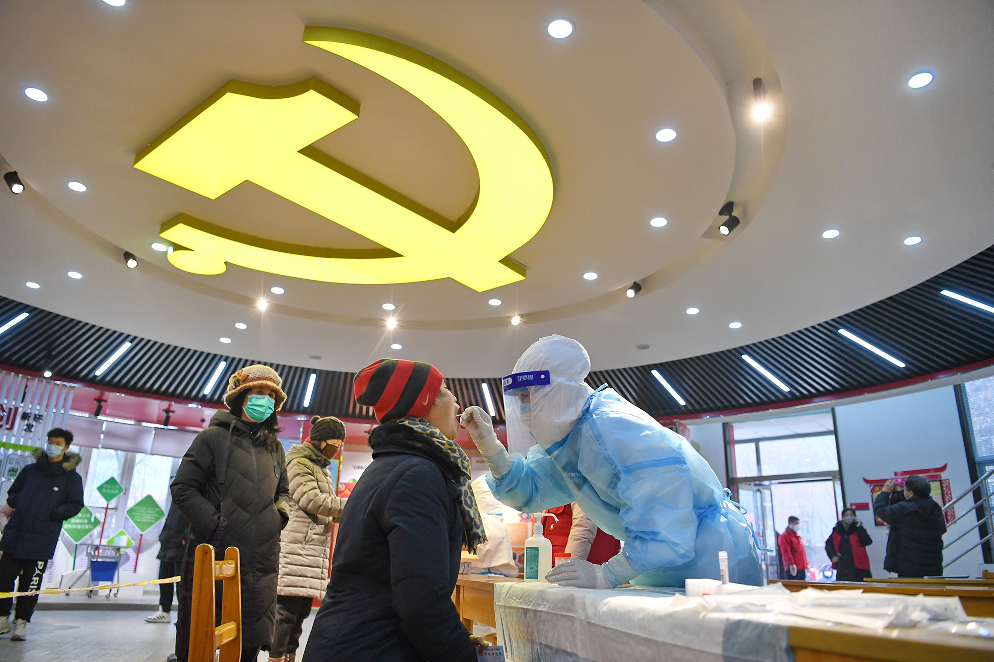 ↑2021年1月25日,醫(yī)護人員在石家莊市裕華區(qū)一小區(qū)為居民進行核酸采樣。