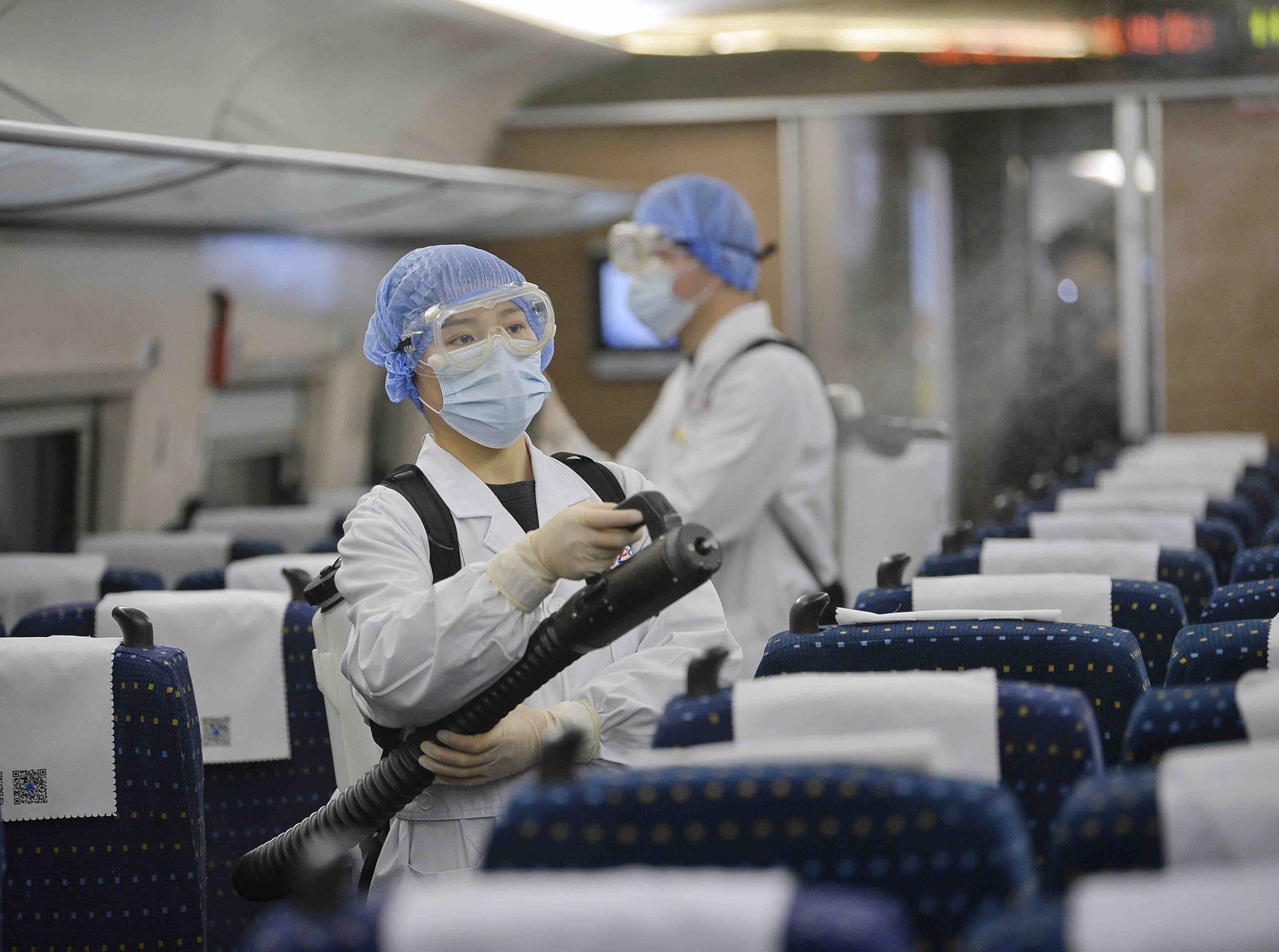 ↑2021年2月2日,中國鐵路成都局集團有限公司成都疾病預防控制中心消毒監(jiān)測科的消毒人員在對列車車廂進行消毒。