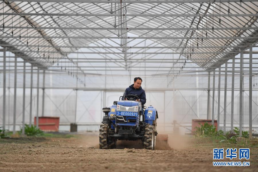 3月1日,工人在浙江省湖州市吳興高新區(qū)靈糧農(nóng)場的大棚內(nèi)駕駛旋耕機進行翻耕。 新華社記者 黃宗治 攝