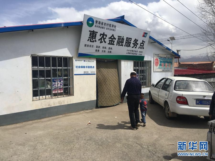 青海省海北藏族自治州門源回族自治縣西沙河村村民前往該村的惠農(nóng)金融服務(wù)點辦理業(yè)務(wù)(2018年5月3日攝)。新華社記者 徐文婷 攝