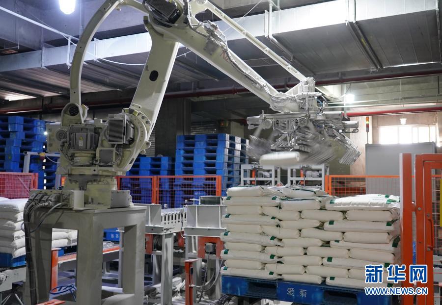 在西安國際港務(wù)區(qū)愛菊農(nóng)產(chǎn)品物流加工園區(qū)內(nèi),面粉生產(chǎn)線上的機械臂在碼放包裝好的面粉(2020年4月8日攝)。 新華社記者 邵瑞 攝