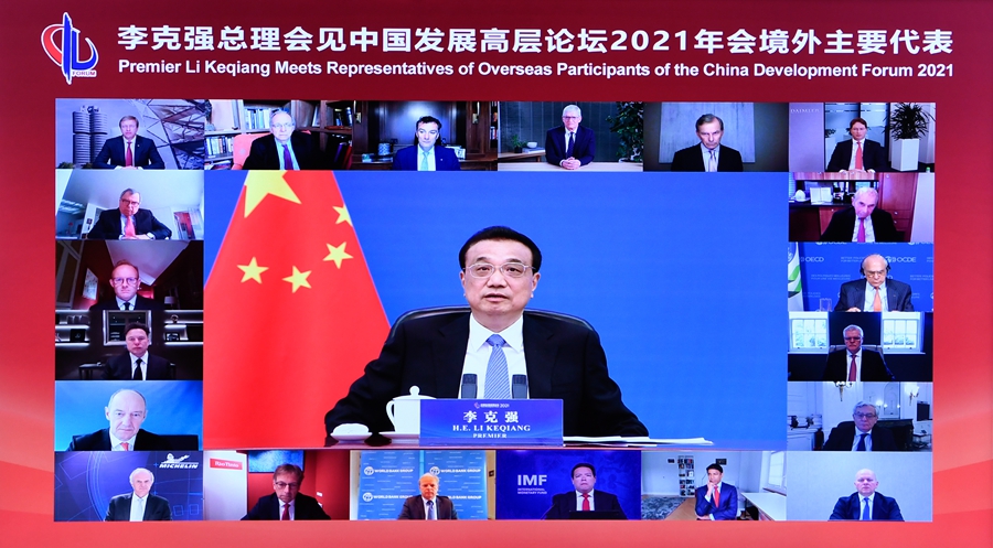 國務(wù)院總理李克強(qiáng)3月22日晚在人民大會堂以視頻方式會見出席中國發(fā)展高層論壇2021年年會的境外代表。來自世界五百強(qiáng)企業(yè)的負(fù)責(zé)人、國際知名學(xué)術(shù)研究機(jī)構(gòu)的專家學(xué)者和主要國際組織代表等參加。